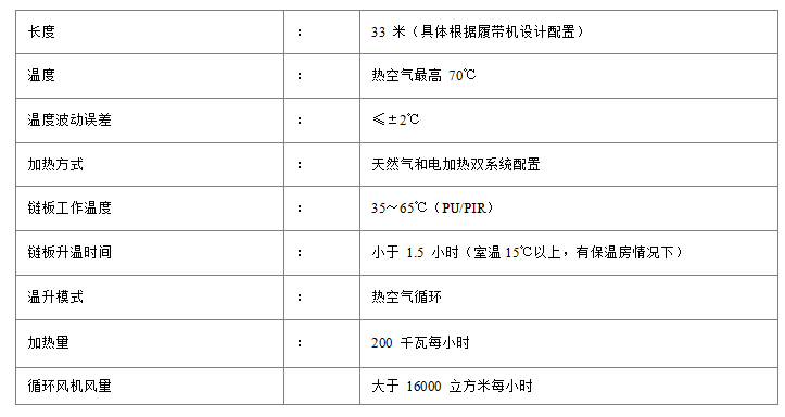 2. 加熱裝置:由于噴撒在上下鋼板之間的聚氨酯液體在雙履帶機(jī)內(nèi),需要在一定的溫度下發(fā)生化學(xué)反應(yīng)和熟成工藝,為了完成這樣的工藝,因而要有向雙履帶機(jī)提供熱風(fēng)的設(shè)備。